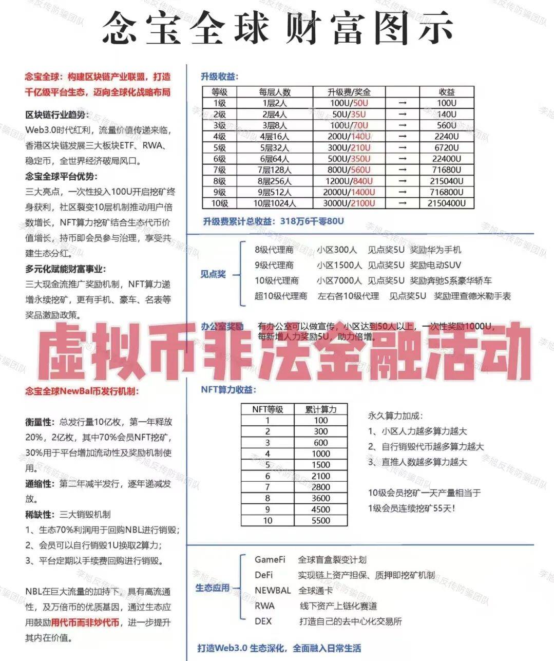 谎称“国家项目”发行所谓的“NIM数字通证”,虚构升值空间。打着“扶贫”“助残”“惜财”的幌子忽悠参与者“自愿捐赠”敛财。