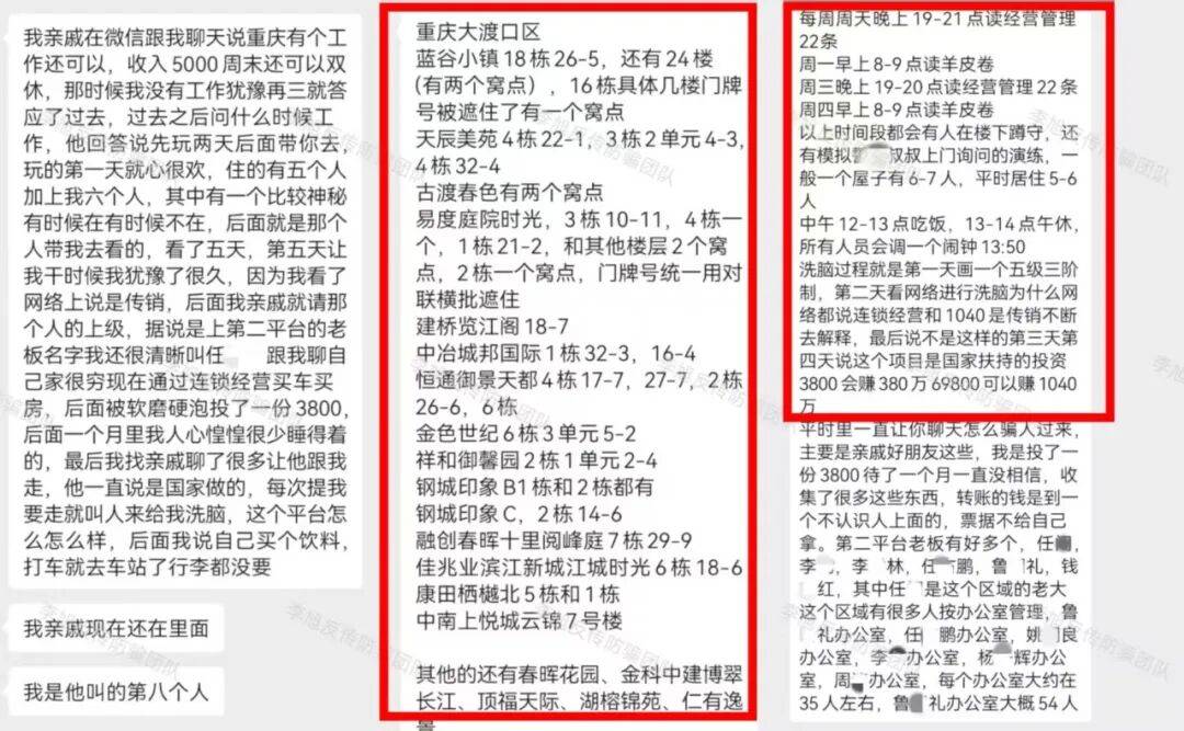 总之就是一个“拖”字。一旦有人提出异议,便会被踢出群聊。甚至利用参与者法律知识盲区,向其散播报帽子叔叔资金无法追回的错误概念,试图以此规避打击。